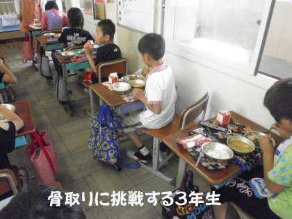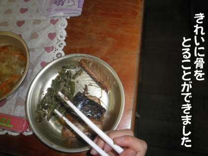 今日の献立に「サバの梅煮」があったので,さっそく試してみたら,みんな上手に骨だけを取り除いていました。
