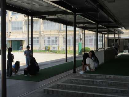暑い日が続きます。子どもたちの昇降口には、ミストが降り注いで、少しでも涼をとれるようにしています。