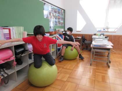 教室の後方でバランスボールに挑戦する6年生。