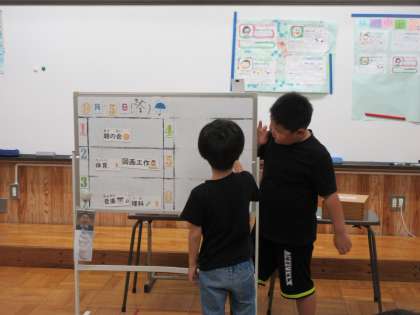 1年生を中心に朝の会で1日の予定を確認しています。