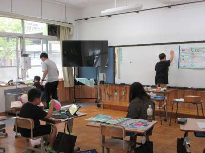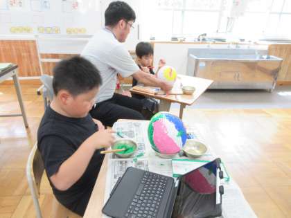 1年生は気球づくり、6年生は文字の学習。