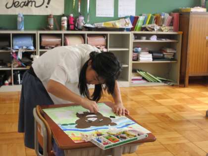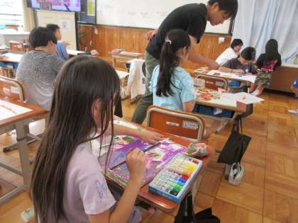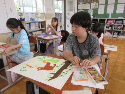 「言葉からそうぞうしたようすやふんいきに合わせてパスの色をくふういてあらわそう」をめあてに描き進めています。
