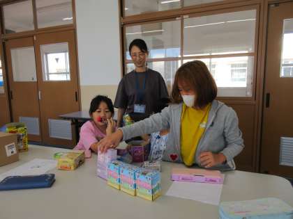 身の回りのものを使って、みんなが楽しめる遊びやゲームを考えました。