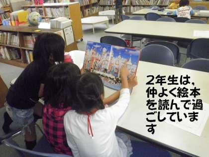 低学年の部は宿題を済ませてから,みんなで仲良く1冊の絵本を読んで過ごしました。間違いさがしや宝物さがしは,子どもたちに人気ある絵本です。