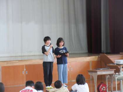 児童会本部会の司会で、10月の児童集会がおこなわれました。