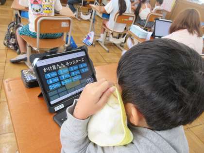 タブレットを使っての九九の学習。