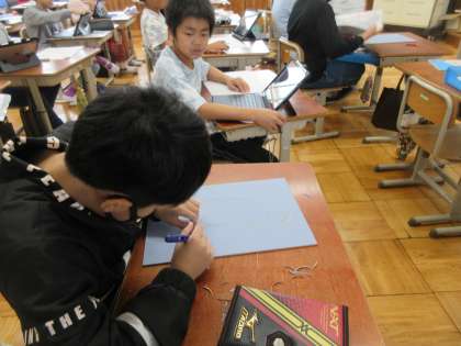 下描きができた人から彫刻刀で彫り始めています。