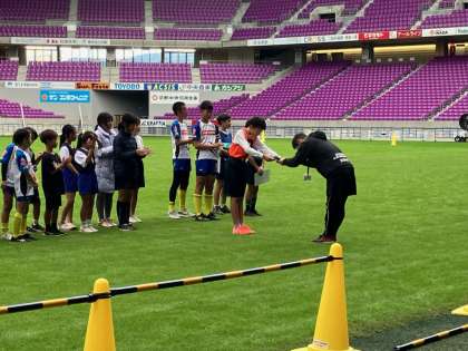 子どもたちは天然芝のグラウンドに感嘆の声を上げつつ、元気いっぱい走り回りました。