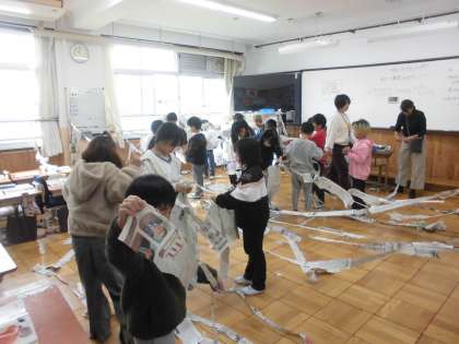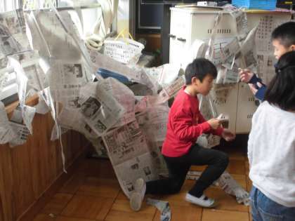 新聞紙を使って教室内で造形遊びを楽しみました。