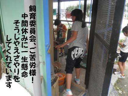 まわりには,1年生が入りたそうに見つめています。月曜日と金曜日はふれあいの日として,飼育委員会の人と一緒に飼育小屋の中に入れることになっています。