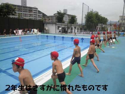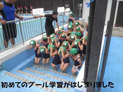 待ちに待ったプール学習がはじまりました。1年生にとっては小学校に入学して初めてのプール学習です。2年生は,さすがに慣れたものでプールでのルールやサインをしっかり覚えててきぱきと行動しています。1年生は2年生を見習って,これから覚えていきます。