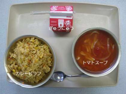 「牛乳」「カレーピラフ」「トマトスープ」です。