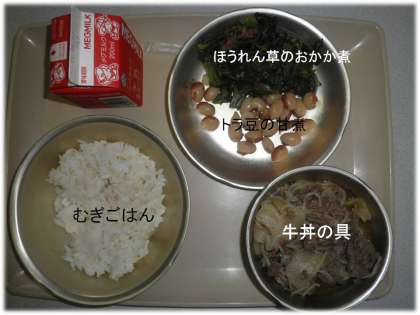 「むぎごはん」「牛丼の具」「ほうれん草のおかか煮」「トラ豆の甘煮」