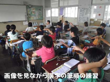 国語の漢字の学習は,これまでは黒板に先生が書いて教えるパターンが一般的でしたが,最近は電子機器(PC)を使った指導に変わってきています。