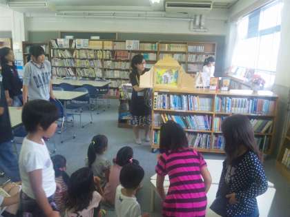 今日の中間休みに,本校の図書館で読み聞かせをしていただきました。