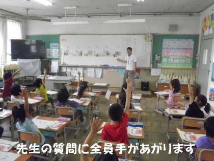 1年生の国語で有名な「大きなかぶ」の学習がスタートしています。子どもたちものりのりでやっています。先生の質問にも全員の手があがります。