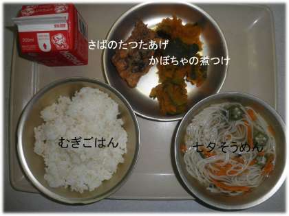 「むぎごはん」「七夕そうめん」「かぼちゃの煮つけ」「さばのたつたあげ」