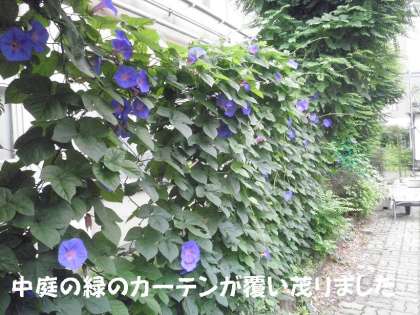 中庭の家庭課室前の「緑のカーテン」(ヘブンリーブルー)は,昨年の苗で育てので,成長が早く,しっかり覆い茂り役に立っています。