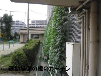 運動場側の「緑のカーテン」(ヘブンリーブルー&ゴーヤ)は,種から育てているので,覆い茂るにはもう少しかかりそうです。