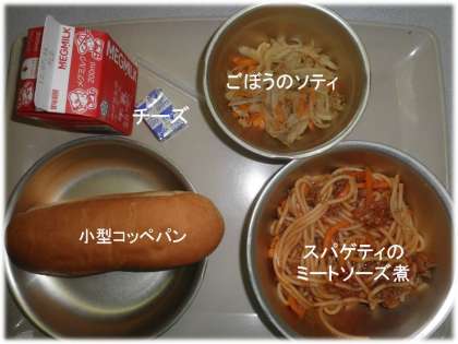 「小型コッペパン」「スパゲティーのミートソース煮」「ごぼうのソティ」