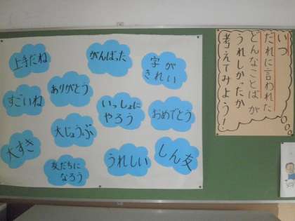 2年生の掲示板に,自分が言われてうれしかったことばがはり出されています。クラスみんなが自然に言えるようにがんばってほしいですね。