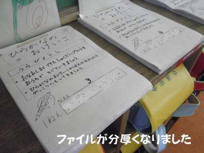教室に,入学してから習ってきたひらがなのファイル(練習プリント)が,個別にファイルしておかれています。