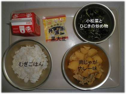 「むぎごはん」「肉じゃが(カレー味」「小松菜とひじきの炒め物」「黒大豆」