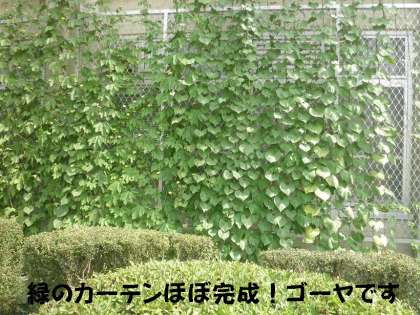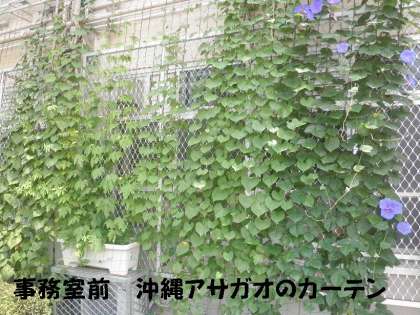 職員室と事務室の運動場側の「緑のカーテン」がほぼ完成し,陽射しをさえぎってくれています。