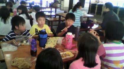 朝早くからお家の人に作っていただいた,おいしいお弁当を野外炊飯場で,みんなうれしそうに食べています。