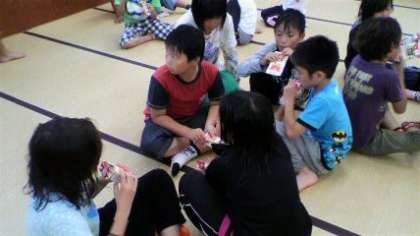 お風呂あがりの後のおやつは,アップルジュースです。アップルジュースでのどを潤して,休憩時間に入ります。