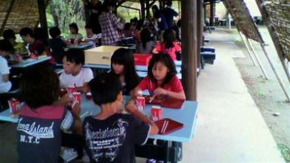 朝食は,芝生広場の横にある東屋で屋外朝食をとりました。