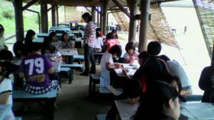 子どもたちは,東屋に集まって,記念品作りをしました。