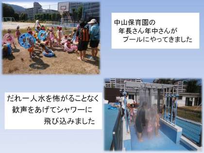今日は,お隣の中山保育園の園児たちが,プール遊びに来てくれました。いつも「保育交流」で5年生や6年生が仲良くしている,年長組と年中組の園児たちが約30名きました。
