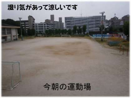 連日,残暑続きで蒸し暑く,学校の運動場や畑はカラカラ状態でしたが,今朝は,湿り気をおびています。