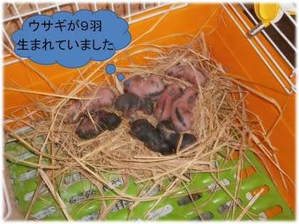 なんで??どうして????オスウサギと分けて飼育しているのに???なんと9羽産まれていました。不思議です。オスウサギがまぎれこんでいたのでしょうか?