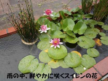 朝の花壇や緑のカーテン,野菜畑もたっぷり自然の水やりができたようで,いきいきしています。特にビオトープやカメ池のスイレンの花が鮮やかに咲いています。
