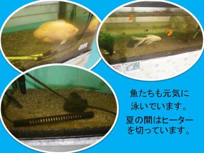 水槽の魚たちは,夏の間,熱帯魚でもヒーターを切っていますが,30度近い水温の中で食欲旺盛です。元気に泳いでいます。