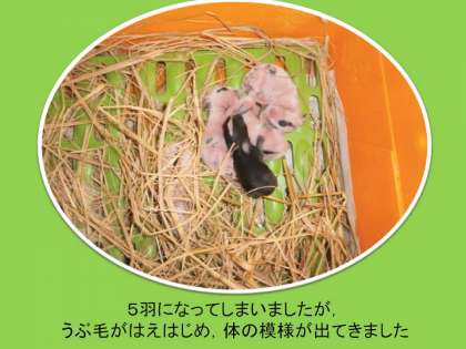 ウサギたちも,もりもりエサを食べて,屋外飼育場を元気に走り回っています。先日産まれた赤ちゃんウサギは,1羽死んで残り5羽になってしまいました。しかし,体にうぶ毛がはえはじめ,模様が出てきています。これ以上減らずに育ってくれればいいのですが。