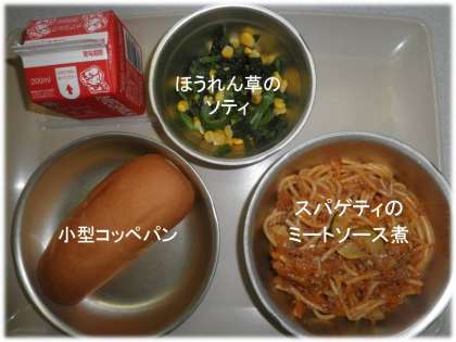 「こがたコッペパン」「スパゲティのミートソース煮」「ほうれん草のソティ」