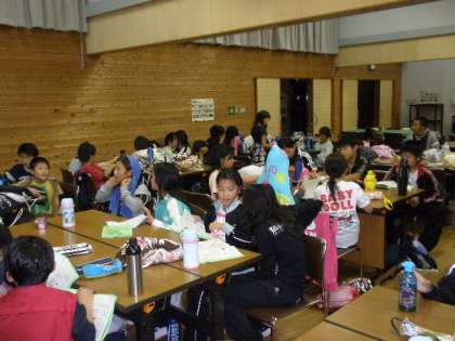 入浴後,班別ミーティングが始まりました。1日目の反省と楽しかったことを出し合いました。その後,班ごとにお菓子とジュースをもらって楽しく語らいました。
