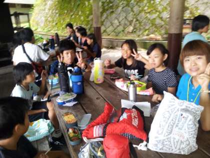 「野外炊飯場1」で,持参したお弁当を班に分かれた食べました。