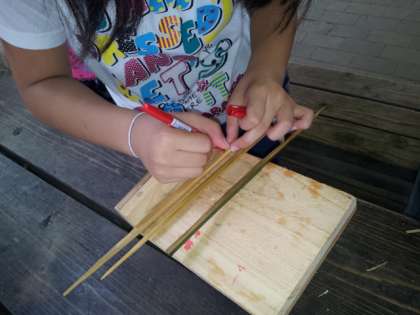 子どもたちは,自分の作った『竹はし』にうれしそうに名前を書いています。
