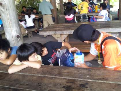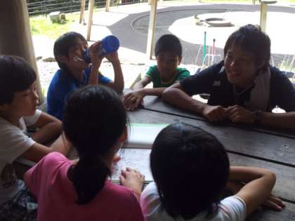子どもたちは,自分たちの役割は終って少し休憩しているときに,班付のスタッフの方と,腕相撲をしたり,これからの活動の打ち合わせをしたり,いろいろなお話をしたりしています。