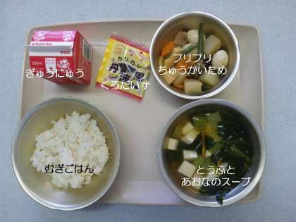 今日の献立は,『豆腐と青菜のスープ』『プリプリ中華炒め』『黒大豆』『麦ご飯』『牛乳』です。