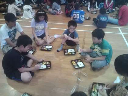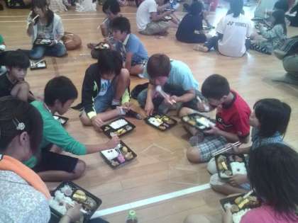 お弁当が配られて,グループで食べました。食べ終わったら,弁当殻は残菜と容器に分け,割り箸を洗って,スタッフのところへ持って行きます。