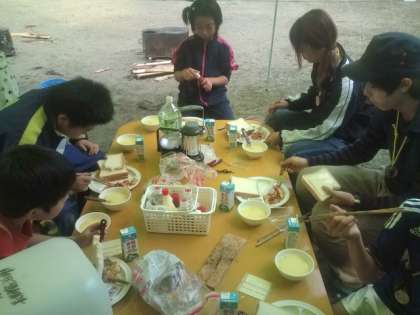 朝食の話題は,テントサイトの設営やドラム缶風呂・体育館でみんなで寝たことなどが多かったです。昨日は,雨のために急な予定変更もありましたが,みんな楽しそうに会話しながら,朝食を食べていました。