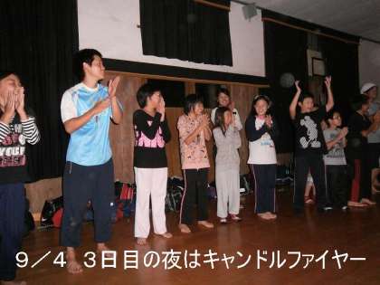 3日目(9/4)キャンドルファイヤー 野営地最後の夜です。疲れもピークでしたが,子どもたちも学生スタッフも先生も,楽しいゲームで笑顔いっぱい!