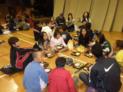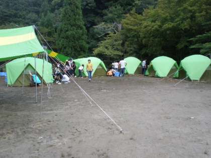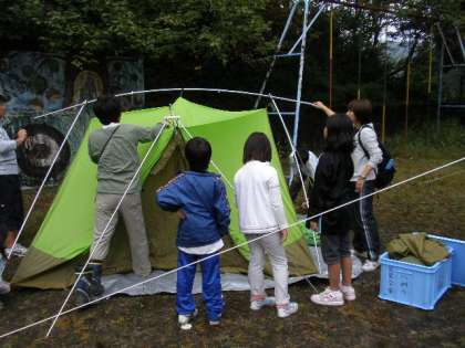 旧八桝小学校に着いて,昼食風景とテントサイトの設営です。昼食時は小雨が降っていましたが,テントを設営するときは晴れてきて予定通りできました。