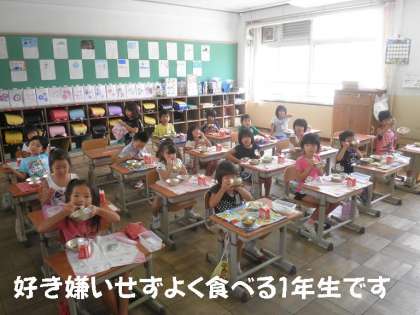 給食の時間は,1年1組の子どもたちと一緒に給食を食べました。