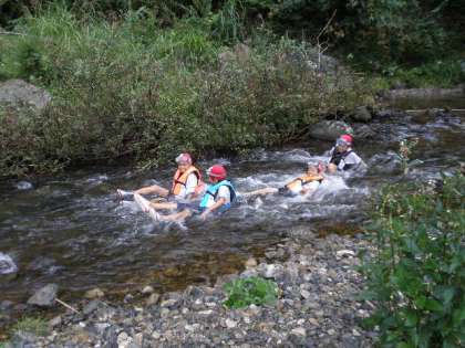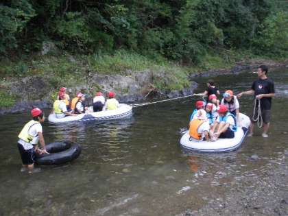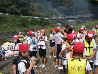 午前中は「川遊び」をしました。水温は相当低く,最初は「冷たい冷たい」と言っていたのですが,日が照ってくると川に飛び込んだりボートから水かけをしたり,はしゃぎ回りました。休憩時間には焚き火にあたったり,ホットココアを飲んだりと時間を忘れて楽しみました。